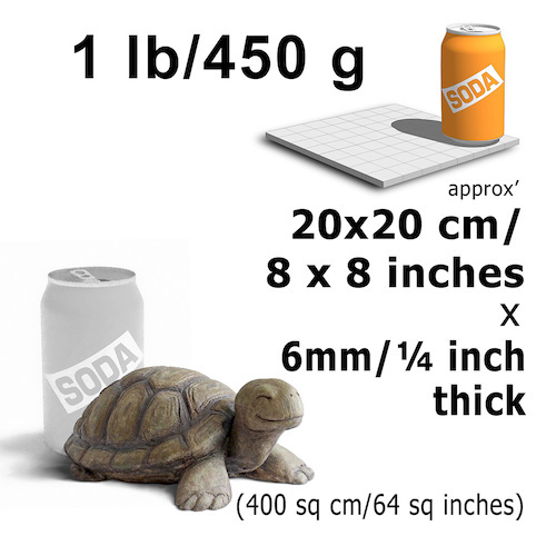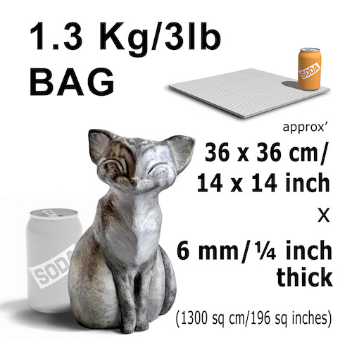 A 1.3 kg bag of dry PTP covers 36 x 36 cm x 6 mm thick
