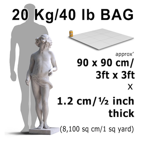 A 20 kg bag of dry PTP covers 110cm x 110 cm x 1 cm thick (approx 1 sq meter)
